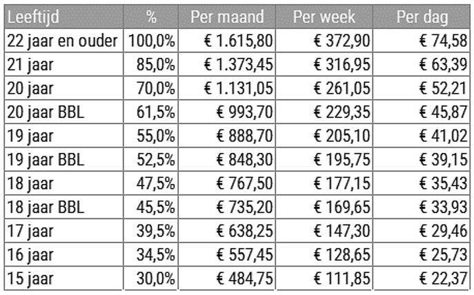 Werknemers die jonger zijn dan 22 jaar moeten op grond van de Wet minimumloon en minimumvakantiebijslag minstens een bepaald percentage van het minimumloon krijgen. Welke bedragen precies voor hen van toepassing zijn, hangt af van hun situatie. Voor werknemers van 18 tot en met 20 jaar die werken op grond van de beroepsbegeleidende leerweg, geldt bijvoorbeeld een lager minimumjeugdloon. Voor leerlingen in de beroepsbegeleidende leerweg in de leeftijd van 15 tot en met 17 jaar en 21 jaar gelden de met hun leeftijd corresponderende jeugdlonen. Zie voor meer informatie onderstaande tabel.